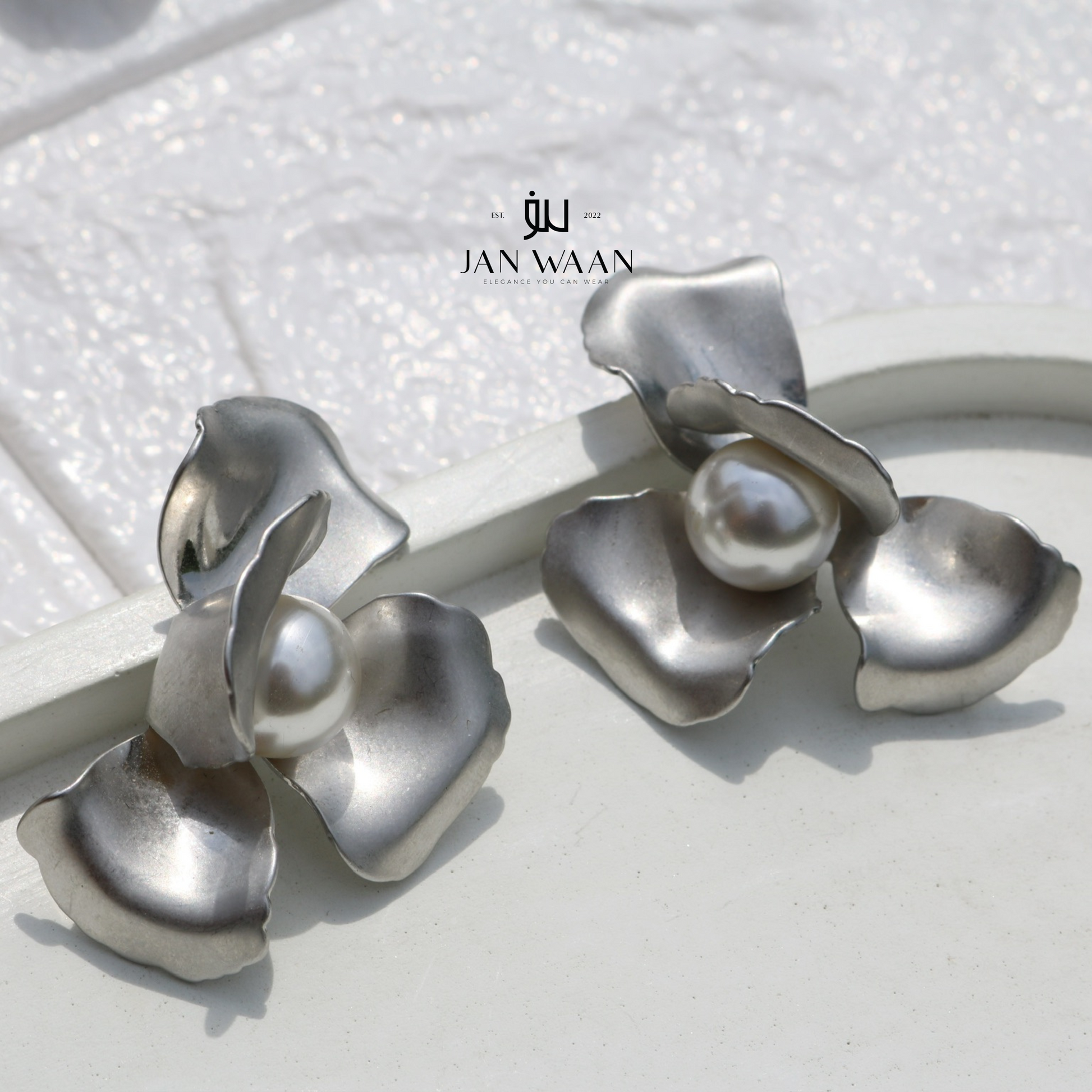 Soft but strong femininity. Eye-catching matte flower earrings with delicate pearls for a perfect balance.Gold/ Silver base color ,Gold plated made on Stainless Steel , freshwater pearls.